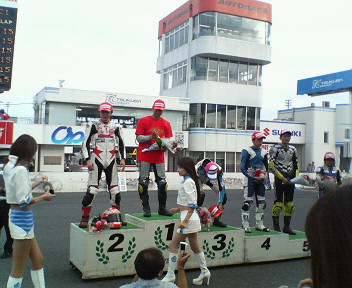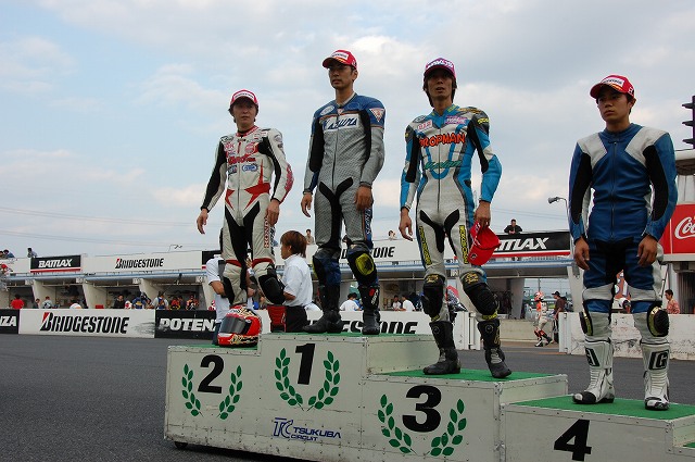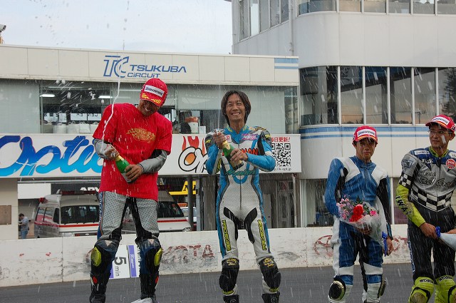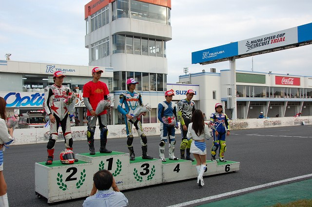 トップは前戦優勝の岡崎選手、2位は筑波ロード選ランク1位の赤間選手(全日本ライダー)、3位は同じく全日本の矢田選手。