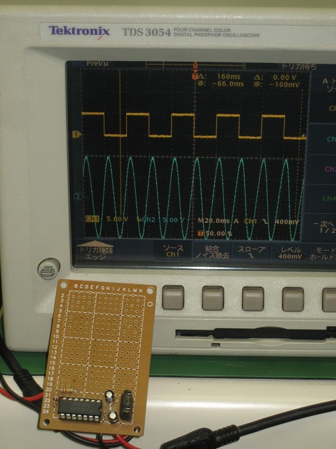 下の青い波形が正常化する前の元の波形で、回路を通って半分の周期になっています。