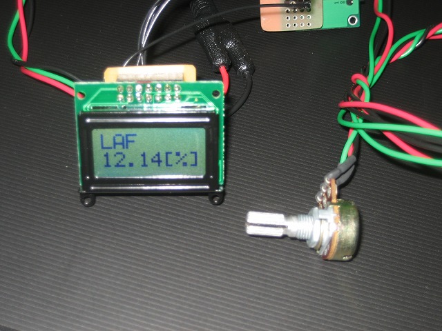 JCさんに作成して頂いたた空燃比センサー出力(0to5V)をパーセント表示する基板です。左手前の小さいやつが基板で、この中にマイコンを搭載しています。左上の緑色のが液晶で、ここに空燃比を表示させます。