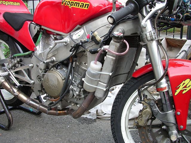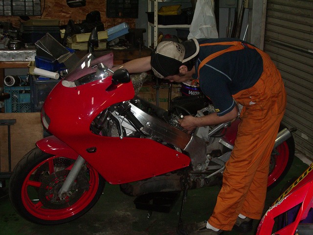 監督さんは、ツアコン改め・・・さんの愛車となる予定のカッコイイNSR250のメンテ作業中でした。