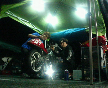 去年のMONOのコースレコーダー、星野さんがお隣のピットです!走り方をいろいろ聞きました。非常に参考になります。ありがとうございます。写真左の青い服の方が星野さんで、今年から250で参戦しています