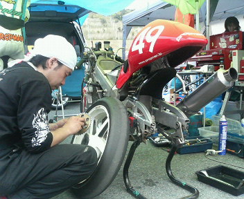 車検無事通過しました!1本目の結果ですが、コースはびっくりするくらい難しいです。アクセル全開の進入ばかりです!鈴鹿に似てますね。僕の苦手な感じですが、コースは覚えたので、次はアクセルのタイミングを色々変更してみます!あと1本頑張ります!写真は監督の整備風景です。簡単にばらばらです。さすが最強のヘルパーです!安心感が違います。