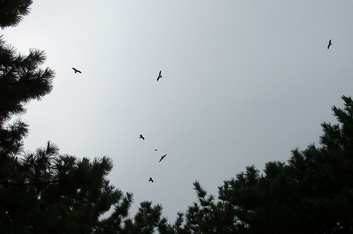 と、そうこうしているうちに、お肉を狙ってなんとトンビの大群が集まってきました〜。