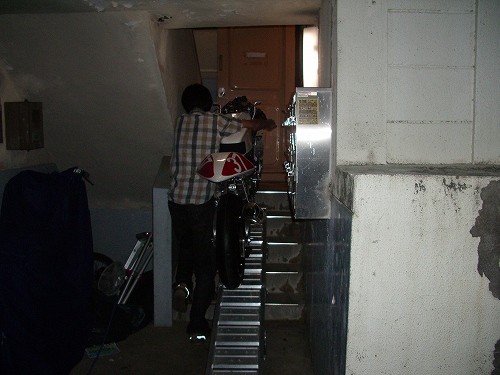 いつもこんな感じで階段にラダーを敷いてバイクの出し入れをしています。。