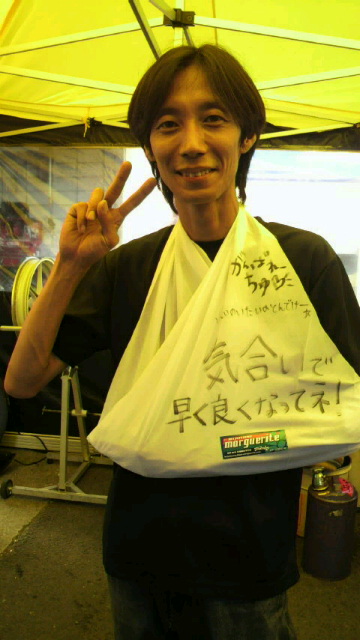 息を切らせて「つっ、坪川選手の状況を教えてください!」ってオフィシャルさんに聞いたら転倒したけど救急車が必要な状況ではなく、シケインのコースサイドで休んでいることを教えていただきました。地図に位置まで記載して丁寧に教えていただき、一旦ピットに戻り、海さんと車で教えていただいた場所まで急いで向かいました。